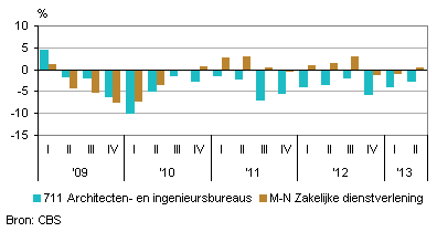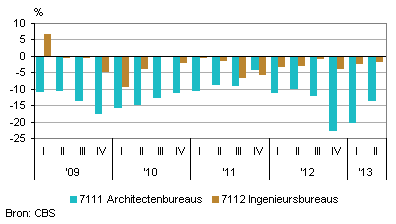 In het tweede kwartaal van 2013 daalde de omzet van de architecten en ingenieurs met 3 procent ten opzichte van dezelfde periode een jaar eerder. De omzetdaling die in het tweede kwartaal van 2009 inzette, is illustratief voor de diepe crisis waarin de Nederlandse bouwsector zich bevindt. De zakelijke dienstverlening als geheel deed het met een omzetstijging van 0,3 procent beter dan de architecten en ingenieurs.