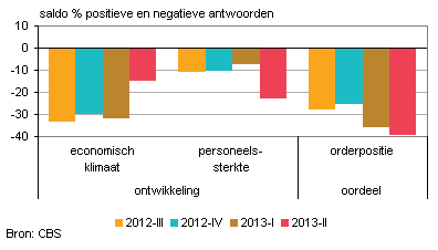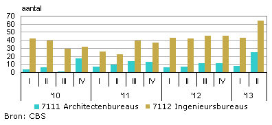 De omzet van de architecten- en ingenieursbureaus daalde in het tweede kwartaal van 2013 opnieuw ten opzichte van dezelfde periode een jaar eerder. Hiermee zet de trend van de afgelopen 4 jaar door. De ingenieurs deden het een stuk minder slecht dan de architecten. Architecten en ingenieurs ervaarden in het tweede kwartaal een verslechtering van het economisch klimaat. Ook voor het derde kwartaal van 2013 voorzien de ondernemers een verdere verslechtering van het economisch klimaat, dalende omzetten en minder werkgelegenheid.