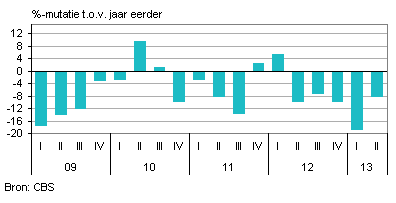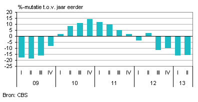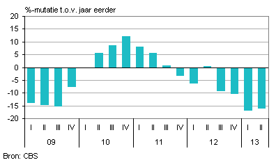 De daling van de omzet in de personenautobranche blijft aanhouden. Na een recordkrimp van 17 procent in het eerste kwartaal van 2013 nam in het tweede kwartaal de omzet ook sterk af. Ten opzichte van het positieve tweede kwartaal van 2012 was de omzet 16 procent lager.