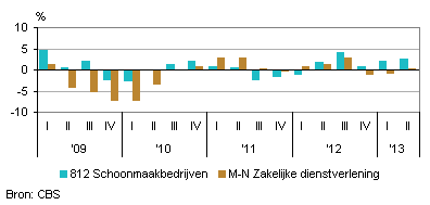 In het tweede kwartaal nam de omzet bij de schoonmaakbedrijven met 2,6 procent toe ten opzichte van dezelfde periode een jaar eerder. Dit was het vijfde kwartaal op rij dat de omzet toenam. Deze toename wordt voor een groot gedeelte veroorzaakt door de omzetstijging van bedrijven die zich toespitsen op de industriële reiniging. De omzet van bedrijven die zich bezig houden met interieurschoonmaak steeg ook, maar minder. De schoonmaakbranche deed het beter dan de totale zakelijke dienstverlening. De omzet van de zakelijke dienstverleners steeg licht met 0,3 procent.