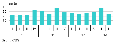 In het tweede kwartaal van 2013 was het aantal uitgesproken faillisementen nagenoeg gelijk aan dezelfde periode een jaar eerder. Er gingen in het tweede kwartaal 25 bedrijven in de branche van de schoonmaakbedrijven, hoveniers e.d. failliet. Over heel 2012 gingen er 106 bedrijven over de kop.