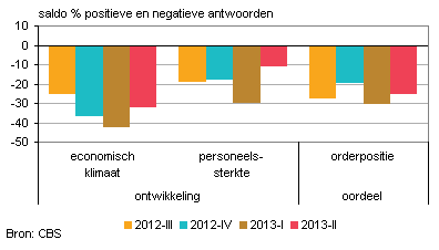 Over de orderpositie in het tweede kwartaal van 2013 waren de ondernemers ook iets minder negatief. Per saldo beoordeelde een kwart van de ondernemers deze als (te) klein.