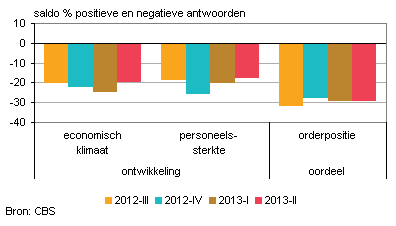 Uit de conjunctuurenquête blijkt dat het aantal ondernemers in de zakelijke dienstverlening dat het economisch klimaat vond verslechteren, kleiner is dan een kwartaal eerder. Toch ervaarde per saldo nog altijd een vijfde van de ondernemers een verslechtering van het economisch klimaat in het tweede kwartaal van 2013. De personeelssterkte nam bij per saldo 18 procent van de zakelijke dienstverleners af. Dit was voor de tweede achtereenvolgende keer een kleiner aantal dan een kwartaal eerder. Over de orderpositie waren de ondernemers nog altijd fors negatief. Per saldo beoordeelde 29 procent van de ondernemers deze als (te) klein.