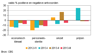 De ondernemers in de zakelijke dienstverlening zijn voor het derde kwartaal van 2013 pessimistisch gestemd. De groep ondernemers die een verdere verslechtering van het economisch klimaat verwacht, is iets groter geworden. Ook is de omzetverwachting fors verslechterd. Vorig kwartaal verwachtte per saldo ruim 15 procent van de zakelijke dienstverleners een toename van de omzet terwijl nu per saldo vijf procent een afname voorziet.