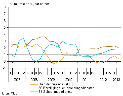 De prijzen van beveiliging en opsporing lagen 1,8 procent hoger dan in het tweede kwartaal van 2012. Na een geleidelijke toename van de prijsstijgingen in de zes eerdere kwartalen is de stijging nu even hoog als in het eerste kwartaal van 2013.