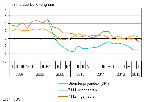 De prijzen van architecten waren evenals vorig kwartaal 3,0 procent lager dan een jaar eerder. Dit is de sterkste prijsdaling sinds het eerste kwartaal van 2010. Dit onderstreept dat de crisis in de bouwsector nog altijd voortduurt. De laatste prijsstijging van architecten was in het eerste kwartaal van 2009.