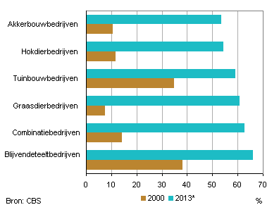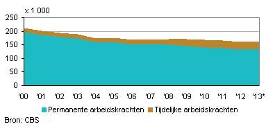 Het aantal bedrijven dat gebruik maakt van tijdelijke arbeidskrachten is inmiddels gestegen tot 59 procent. Dat is een stijging van 2 procentpunt ten opzichte van vorig jaar. In 2000 werd slechts bij 14 procent van de agrarische bedrijven gebruik gemaakt van tijdelijk personeel. Bij de graasdierbedrijven is de toename het grootst. In 2000 was bij 7 procent van de graasdierbedrijven sprake van inzet van tijdelijk personeel. Dit is opgelopen tot 61 procent in 2013.