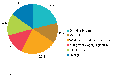 Werknemers volgen een werkgerelateerde cursus om uiteenlopende redenen. Bijna een kwart van hen verwacht vooral het werk beter te kunnen doen of er betere carrièreperspectieven door te krijgen. Ruim 20 procent geeft aan met cursussen bij te willen blijven in het eigen vakgebied. Een kleiner aandeel cursisten volgt een werkgerelateerde cursus omdat hij of zij daartoe verplicht is.