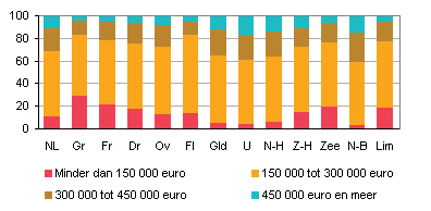 In Groningen ziet deze verdeling er heel anders uit. Daar woont 29 procent van de paren met kinderen in een woning onder de 150 duizend euro, 16 procent bewoont een woning met een WOZ-waarde van meer dan 300 duizend euro.