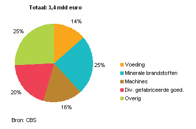 Een kwart van de invoer bestaat uit minerale brandstoffen. De invoer hiervan nam met 9 procent toe tot 0,8 miljard euro. Hierdoor steeg het aandeel van minerale brandstoffen in de totale invoer van Denemarken naar 25 procent. Nederland voerde minder aardolie en minder aardolieproducten in, maar meer aardgas en turf. De import van machines daalde met 5 procent tot 0,6 miljard euro. Binnen deze productgroep viel vooral het aandeel telecommunicatietoestellen op; hiervan werd 12 procent minder uitgevoerd.