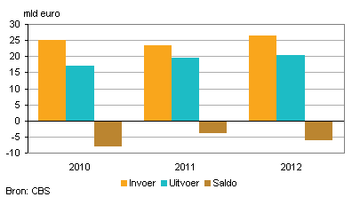 Nederland heeft in 2012 voor 26,4 miljard euro aan goederen uit de VS van Amerika ingevoerd. Dit is 12 procent meer dan in 2011. Het tekort op de handelsbalans nam met ruim 2 miljard euro toe tot 6,1 miljard euro.