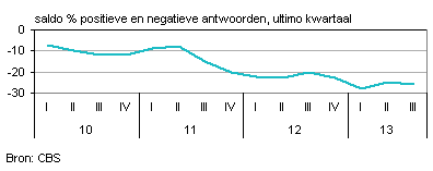In de maanden van het derde kwartaal van 2013 was het vertrouwen van consumenten gemiddeld even laag als in het tweede kwartaal. Vanaf oktober is er echter een duidelijke verbetering zichtbaar. Vooral van oktober op november is het vertrouwen fors toegenomen. De indicator van het consumentenvertrouwen verbeterde toen 9 punten en kwam uit op -18. In oktober was er al een verbetering van 6 punten. Zo’n sterke verbetering in zo’n korte tijd is uitzonderlijk, maar met -18 overtreft het percentage pessimisten nog altijd ruimschoots het percentage optimisten. Het consumentenvertrouwen is gebaseerd op het oordeel van consumenten over de algemene economische situatie en op hun oordeel over de eigen financiële situatie (de koopbereidheid).