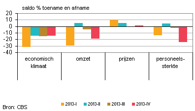 De horecaondernemers zijn somber gestemd voor het vierde kwartaal van 2013. Per saldo verwacht bijna een vijfde van hen een afname van de omzet. Ook de vooruitzichten voor de werkgelegenheid zijn slechter dan de voorgaande kwartalen. Per saldo verwacht bijna een kwart van de ondernemers minder personeel in te zetten in het vierde kwartaal. Ook de verwachtingen over het economisch klimaat zijn negatiever dan in de voorgaande twee kwartalen. De verwachting is dat de afzetprijzen nagenoeg gelijk blijven.