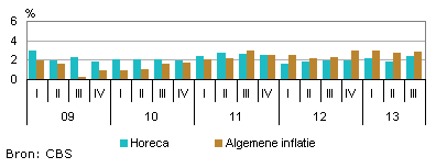 De prijzen in de traditionele horeca stegen in het derde kwartaal van 2013 met gemiddeld 2,3 procent in vergelijking met een jaar eerder. In vergelijking met de inflatie lag de prijsontwikkeling in de horeca een half procentpunt lager. Hieruit blijkt de terughoudendheid van horecaondernemers om prijsverhogingen door te voeren.