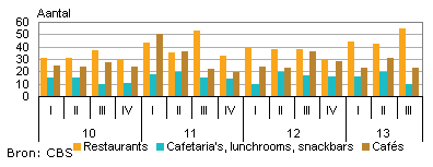 In het derde kwartaal gingen 55 restaurants failliet, 45 procent meer dan een jaar eerder. Het aantal cafetaria’s en cafés dat in het derde kwartaal failliet verklaard werd, ligt voor beide sectoren juist lager dan vorig jaar. Er gingen in het derde kwartaal 10 cafetaria’s failliet en 23 cafés. In het tweede kwartaal waren dit er respectievelijk 19 en 31.