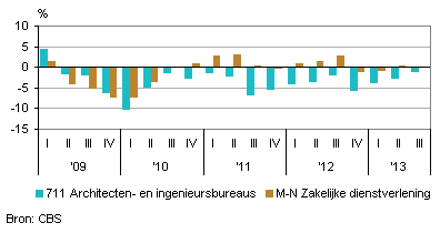In het derde kwartaal van 2013 daalde de omzet van de architecten en ingenieurs met 1,4 procent ten opzichte van dezelfde periode een jaar eerder. De reeks van omzetdalingen die in het tweede kwartaal van 2009 begon, zet zich hiermee voort. De omzetdaling van 1,4 procent in het derde kwartaal was echter de kleinste in deze negatieve reeks. De zakelijke dienstverlening als geheel deed het met een omzetdaling van 0,3 procent minder slecht dan de architecten en ingenieurs.