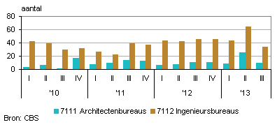 In het derde kwartaal van 2013 daalde de omzet van de architecten met ruim 13 procent. Sinds het eerste kwartaal van 2009 is de omzetontwikkeling in deze branche zonder uitzondering fors negatief. De index van deze statistiek (2010=100) stond in het derde kwartaal op 64. Eind 2008 was dit 148. Sindsdien volgde een dalende lijn. De omzet in de ingenieursbranche daalde in het derde kwartaal licht met 0,3 procent ten opzichte van dezelfde periode een jaar eerder. Dit was het derde kwartaal op rij waarin de omzetdaling afzwakte. De laatste omzetstijging dateert voor de ingenieurs uit het eerste kwartaal van 2009. De index (2010=100) van de ingenieursbranche stond in het derde kwartaal op 84.