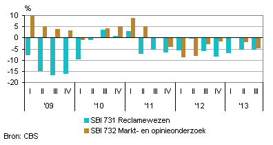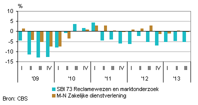 Ten opzichte van een jaar eerder is de omzet van de reclame- en marktonderzoeksbranche in het derde kwartaal met 5,2 procent gedaald. Sinds het tweede kwartaal van 2011 krimpt de omzet in de branche onafgebroken. De reclame- en marktonderzoeksbranche presteerde slechter dan de gehele zakelijke dienstverlening, waar de omzetdaling in het derde kwartaal 0,3 procent bedroeg.