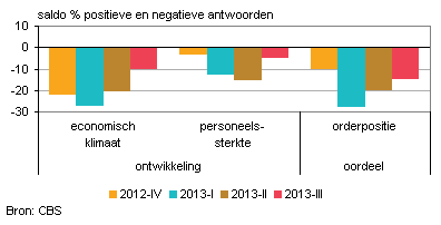 Uit de conjunctuurenquête blijkt dat het oordeel van de ondernemers over het derde kwartaal minder negatief is dan een kwartaal eerder. Nog altijd is het aantal ondernemers dat vindt dat het economisch klimaat, de personeelssterkte en de orderpositie verslechterd is, groter dan het aantal ondernemers dat meent dat dit verbeterd is. Het verschil is in alle drie de categorieën wel kleiner geworden. Zo meende per saldo 10 procent van de ondernemers dat het economisch klimaat was verslechterd. Een kwartaal eerder was dit nog 20 procent.