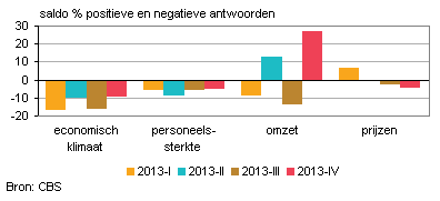 De ondernemers zijn voor het vierde kwartaal minder pessimistisch gestemd dan vorig kwartaal. Opvallend is de omslag van de omzetverwachting. Waar vorig kwartaal de ondernemers per saldo nog een afname van de omzet verwachtten, is dit nu omgeslagen in een toename. Een positieve omzetverwachting voor het vierde kwartaal is echter niet ongebruikelijk voor deze branche. Verder verwachten per saldo nog steeds meer ondernemers een verslechtering van het economisch klimaat en een afname van het personeelsbestand. Het aandeel negatieve antwoorden is per saldo wel kleiner geworden. Alleen de verwachtingen over de prijzen zijn verslechterd.