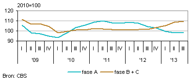 In het derde kwartaal van 2013 steeg het seizoensgecorrigeerde aantal uitzenduren fase A licht met 0,5 procent ten opzichte van een kwartaal eerder. Het seizoensgecorrigeerde aantal uren in fase B en C (detacheringsuren) steeg met 0,7 procent ten opzichte van het tweede kwartaal van 2013. Daarmee lijkt de toename van het aantal detacheringsuren, sinds het vierde kwartaal van 2011, af te zwakken.