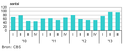 Ook in het derde kwartaal van 2013 was het aantal faillissementen in de uitzendbranche erg hoog. Er gingen 94 bedrijven failliet, een forse toename in vergelijking met dezelfde periode een jaar eerder.