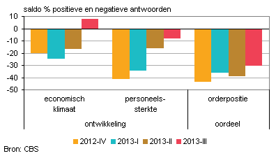 Uit de conjunctuurenquête blijkt dat ondernemers in de uitzendbranche positiever gestemd waren over het economisch klimaat in het derde kwartaal dan in eerdere kwartalen. Per saldo zag bijna 8 procent van de ondernemers het economisch klimaat verbeteren. Hoewel een kleine meerderheid van de ondernemers de personeelssterkte zag afnemen, is dat aantal de laatste kwartalen nog niet zo laag geweest. Ondernemers in de uitzendbranche beoordeelden hun orderpositie de afgelopen kwartalen continu als te klein. Met per saldo 30 procent van de ondernemers was dat aandeel wel weer wat lager dan in voorgaande kwartalen.