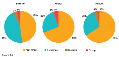 De grootste aanvoerposten in de sectorbalansen zijn krachtvoer en kunstmest. Hiermee wordt circa 90 procent van de mineralen aangevoerd. Bij stikstof bedraagt het aandeel krachtvoer circa 55 procent en het aandeel kunstmest circa 35 procent. Bij fosfor en kalium zijn de bijdragen van krachtvoer ruim 80 procent respectievelijk ruim 75 procent, terwijl de bijdragen van kunstmest bijna 10 procent respectievelijk ruim 10 procent zijn. Vergeleken met 1990 is het aandeel krachtvoer gestegen en het aandeel kunstmest gedaald.