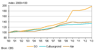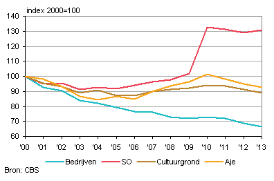 Vanaf 2000 is het aantal fruitbedrijven met 34 procent gedaald tot 1,6 duizend bedrijven in 2013. In dat jaar hadden de fruitbedrijven 20 duizend hectare landbouwgrond in gebruik, wat 11 procent minder is dan in 2000. In 2013 werd met één arbeidsjaareenheid 3,9 hectare grond bewerkt en 71 duizend euro standaardopbrengst gegenereerd. In 2000 was dit nog 4,0 hectare grond en 51 duizend euro standaardopbrengst. De hogere productiviteit leidde bij de fruittelers tot een 41 procent hogere standaardopbrengst per arbeidsjaar. De standaardopbrengst van de totale fruitsector is in de periode 2000-2013 met 31 procent toegenomen.