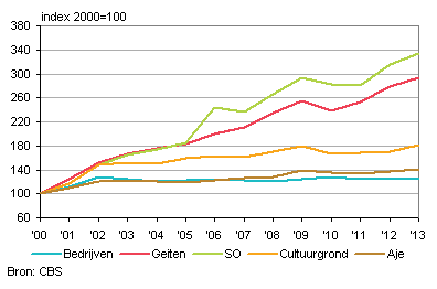 Vanaf 2000 is het aantal geitenbedrijven met 26 procent gestegen tot 362 bedrijven in 2013. In dat jaar hadden de geitenbedrijven 6,0 duizend hectare landbouwgrond in gebruik, wat 81 procent meer is dan in 2000. Op de bedrijven waren 368 duizend duizend dieren, wat 193 procent meer is dan in 2000. In 2013 werd met één arbeidsjaareenheid 7,5 hectare grond bewerkt, 462 dieren verzorgd en 131 duizend euro standaardopbrengst gegenereerd. In 2000 was dit nog 5,9 hectare grond, 222 dieren en 55 duizend euro standaardopbrengst. De hogere productiviteit leidde bij de geitenbedrijven tot een 137 procent hogere standaardopbrengst per arbeidsjaar. De standaardopbrengst van de totale geitensector is in de periode 2000-2013 met 233 procent toegenomen.