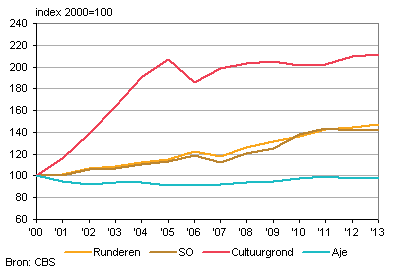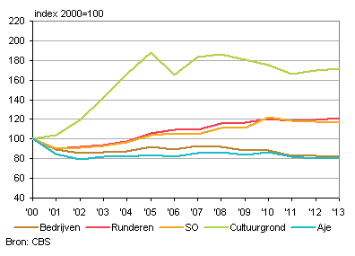 Vanaf 2000 is het aantal vleeskalverenbedrijven met 18 procent gedaald tot 1,3 duizend bedrijven in 2013. In dat jaar hadden de vleeskalverenbedrijven 21 duizend hectare landbouwgrond in gebruik, wat 72 procent meer is dan in 2000. Op de bedrijven waren 847 duizend duizend dieren, wat 21 procent meer is dan in 2000. In 2013 werd met één arbeidsjaareenheid 9,3 hectare grond bewerkt, 366 dieren verzorgd en 297 duizend euro standaardopbrengst gegenereerd. In 2000 was dit nog 4,4 hectare grond, 245 dieren en 206 duizend euro standaardopbrengst. De hogere productiviteit leidde bij de vleeskalverenhouders tot een 44 procent hogere standaardopbrengst per arbeidsjaar. De standaardopbrengst van de totale vleeskalverensector is in de periode 2000-2013 met 17 procent toegenomen.