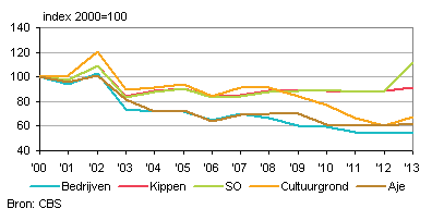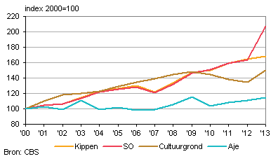 Vanaf 2000 is het aantal vleeskuikenbedrijven met 46 procent gedaald tot 428 bedrijven in 2013. In dat jaar hadden de vleeskuikenbedrijven 8,7 duizend hectare landbouwgrond in gebruik, wat 32 procent minder is dan in 2000. Op de bedrijven waren 40 miljoen duizend dieren, wat 9 procent meer is dan in 2000. In 2013 werd met één arbeidsjaareenheid 9,6 hectare grond bewerkt, 44 duizend dieren verzorgd en 607 duizend euro standaardopbrengst gegenereerd. In 2000 was dit nog 8,7 hectare grond, 30 duizend dieren en 335 duizend euro standaardopbrengst. De hogere productiviteit leidde bij de vleeskuikenhouders tot een 81 procent hogere standaardopbrengst per arbeidsjaar. De standaardopbrengst van de totale vleeskuikensector is in de periode 2000-2013 met 12 procent toegenomen.