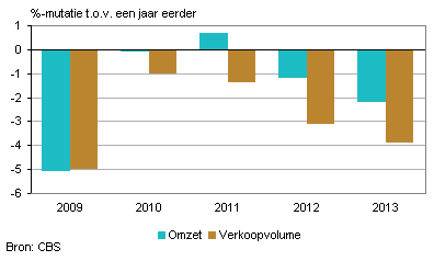 In 2013 nam de omzet van de detailhandel met 2,2 procent af door een daling van de verkopen. Prijzen stegen met een krappe 2 procent. De omzetdaling over 2013 was de grootste van de afgelopen drie jaar. Na het slechte jaar 2009, toen de omzet met ruim 5 procent slonk, leek de detailhandel te herstellen. In 2010 volgde een minieme omzetkrimp en in 2011 werd een omzetstijging gerealiseerd. In 2012 zakten de verkopen echter terug en ook in 2013 krompen de volumes sterk.