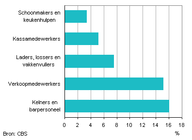 Een bijbaan in de horeca of in een winkel komt onder studenten het meeste voor. In totaal verdiende 16 procent van de werkende studentenin het hoger onderwijs in 2012 bij als kelner of barpersoneel. Op de tweede plaats kwam een baan als verkoopmedewerker(15 procent). Ruim 8 procent had een bijbaan als lader, losser of vakkenvuller.