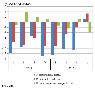 De gespecialiseerde bouw, zoals bouwinstallatie-, sloop- en dakdekkersbedrijven, kromp in 2013 met bijna 3 procent. De krimp nam elk kwartaal af, en in het vierde kwartaal was er zelfs groei. De grond, water- en wegenbouw liet in 2012 nog een omzetstijging zien, maar verloor in 2013 bijna 2 procent.