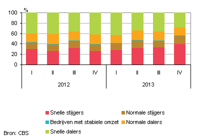 Vanaf het vierde kwartaal van 2012 had een steeds groter deel van de bouwbedrijven een omzet die hoger was dan in hetzelfde kwartaal een jaar eerder. Er waren in het vierde kwartaal zelfs meer bedrijven met een omzetstijging dan een omzetdaling. Ook het aantal snelle stijgers, bedrijven waarvan de omzet meer dan twintig procent steeg, nam in deze periode toe. Dit aantal steeg van 26 procent naar 40 procent.