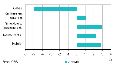 De horeca heeft in het vierde kwartaal 1,5 procent meer omgezet dan in hetzelfde kwartaal een jaar eerder. De groei was minder sterk dan in het derde kwartaal, maar het ging wel beter dan de eerste twee kwartalen van 2013. Hotels, verblijfrecreatie, restaurants, snackbars, en cateringbedrijven realiseerden omzetgroei. Cafés daarentegen hebben in het vierde kwartaal 5 procent minder omgezet en drukten daarmee de omzetgroei van de totale horeca.
