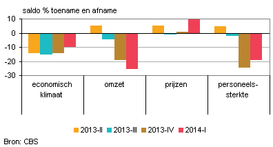 De horecaondernemers zijn somber gestemd over het eerste kwartaal van 2014. Per saldo verwacht meer dan een vierde van hen een afname van de omzet. De verwachtingen voor de werkgelegenheid zijn iets minder slecht dan voorgaande kwartalen maar per saldo voorziet een vijfde van de ondernemers nog altijd minder personeel in te zetten. Overigens is het niet ongebruikelijk dat de ondernemers minder bedrijvigheid voorzien in een eerste kwartaal.