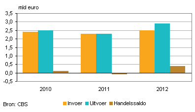 In 2012 is de export van goederen naar Taiwan met 27 procent gestegen tot 2,9 miljard euro. Er werden vooral meer machines uitgevoerd. De invoer uit Taiwan nam met 9 procent toe tot 2,5 miljard euro. Ook hier zijn machines verantwoordelijk voor deze toename. Het saldo op de handelsbalans veranderde van een tekort in een overschot van 0,4 miljard euro.