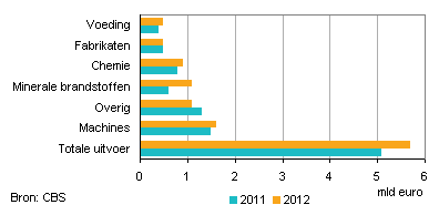 Nederland exporteerde voor ruim 1 miljard euro (+70 procent) aan minerale brandstoffen naar Zwitserland. Met een aandeel van bijna een vijfde in de totale export is dit, na machines, het belangrijkste exportproduct. De uitvoer van machines steeg in 2012 met 4 procent tot 1,6 miljard euro. Er werden vooral meer personenauto’s (+6800 stuks) uitgevoerd.