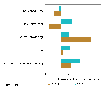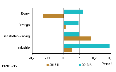 De toegevoegde waarde van de goederenproducenten is in het vierde kwartaal van 2013 met 2,3 procent gegroeid ten opzichte van een jaar eerder. In het derde kwartaal was er sprake van een groei van 0,4 procent. In 2013 is de toegevoegde waarde van de goederenproducenten in totaal met 0,2 procent gegroeid.