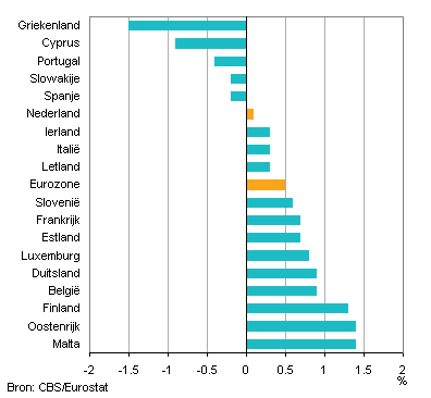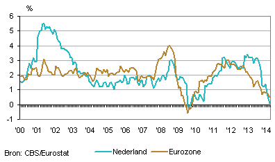De inflatie in Nederland is sinds begin dit jaar lager dan het gemiddelde van de eurozone. Eurostat maakte vanmorgen bekend dat de inflatie in de eurozone in maart 2014 is gedaald naar 0,5 procent. De inflatie in Nederland volgens de Europees geharmoniseerde methode kwam uit op 0,1 procent.