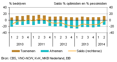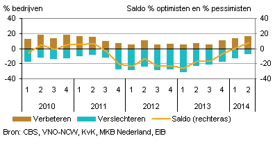 Voor het tweede kwartaal van 2014 zijn er meer ondernemers die een verbetering van het economisch klimaat voorzien, dan ondernemers die een verslechtering verwachten. Dit is voor het eerst in drie jaar tijd. Van de ondernemers verwacht 16 procent een verbetering en 8 procent een verslechtering. Ruim driekwart verwacht geen verandering in het economisch klimaat.