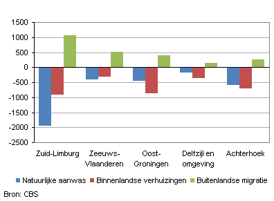 In ons land zijn vijf gebieden waar het bevolkingsaantal al minimaal vijf jaar ieder jaar daalt. Het zijn Oost-Groningen, Delfzijl en omgeving, de Achterhoek, Zeeuws-Vlaanderen en Zuid-Limburg, alle gelegen aan de randen van ons land. In alle vijf krimpregio’s vertrekken inwoners naar andere regio’s en overlijden bovendien meer mensen dan er worden geboren. De bevolkingsverliezen worden deels opgevangen door de komst van mensen uit het buitenland. In Zeeuws-Vlaanderen en Zuid-Limburg was het effect van de buitenlandse migratie aanzienlijk sterker dan gemiddeld in Nederland.