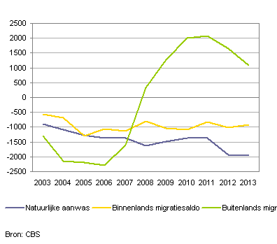 Natuurlijke aanwas en migratiesaldo van Zuid-Limburg, 2003–2013.