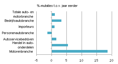 In het eerste kwartaal van 2014 nam de omzet van de motor- en autobranche toe met ruim 1 procent vergeleken met het eerste kwartaal van 2013. Bijna alle branches lieten een positieve ontwikkeling zien. Met ruim 18 procent was de omzetstijging bij de motorbranche het grootst. De omzet van de personenautobranche liet als enige een daling zien.