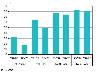 De gemiddelde leeftijd waarop vrouwen hun eerste kind krijgen is de afgelopen decennia sterk toegenomen van ruim 24 jaar voor kinderen geboren in 1970 tot bijna 30 jaar in 2013. Meer dan een derde van de vrouwen die zijn geboren in de jaren vijftig had voor de 25e verjaardag al een kind. Voor vrouwen die zijn geboren in de jaren 1960–1970 ligt dat aandeel veel lager (17 procent en 14 procent). Uitstel betekent meestal geen afstel. Voor vrouwen die zijn geboren in de jaren vijftig ligt het aandeel kinderloze 40-jarigen op 17 procent. Van de tussen 1950 en 1960 geboren vrouwen is uiteindelijk 19 procent op die leeftijd nog kinderloos. Overigens is het aantal kinderen dat moeders krijgen redelijk constant gebleven in de loop van de tijd.