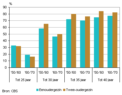 Kinderen uit een eenoudergezin zijn eerder toe aan een partnerrelatie en een eigen gezin dan kinderen die zijn opgegroeid bij twee ouders. Van de vrouwen die zijn geboren tussen 1960 en 1970 en opgroeiden met één ouder was 19 procent moeder op hun 25e. Woonden ze met beide ouders, dan was 16 procent op die leeftijd moeder. Opvallend is dat vrouwen die opgroeiden in een gezin met twee ouders gemiddeld later, maar uiteindelijk wel vaker moeder worden.
