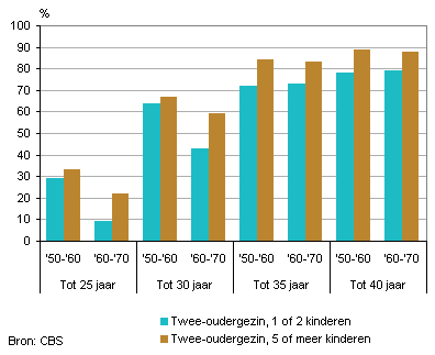 Voor 1950-'60 en 1960-'70 generaties blijken vrouwen uit kleine gezinnen hun moederschap vaker uit te stellen of af te stellen dan vrouwen uit grote gezinnen. Een op de tien vrouwen die in de jaren zestig zijn geboren en zijn opgegroeid in een klein gezin kregen hun eerste kind voor hun 25e. Van de vrouwen uit een groot gezin is dat één op de vijf. Verder is bijna een kwart van de vrouwen die zijn geboren in de jaren vijftig en uit een klein gezin komen tot en hun 40e kinderloos gebleven. Van de vrouwen uit grote gezinnen is dit 10 procent.