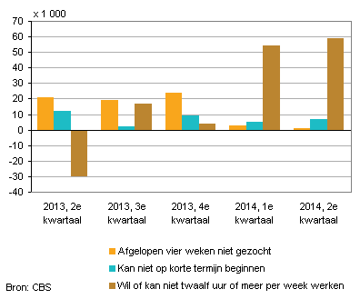 In het tweede kwartaal van 2014 behoorden 1,2 miljoen jongeren tot de niet-beroepsbevolking. Dit waren er 65 duizend meer dan een jaar eerder. Het overgrote deel van de toename (59 duizend) bestond uit jongeren die aangaven niet twaalf uur of meer te kunnen of willen werken. Het aantal jongeren dat op korte termijn aan een baan kan beginnen, maar de afgelopen vier weken niet heeft gezocht, was vrijwel even hoog als in het tweede kwartaal van 2013. In hetzelfde tijdsbestek nam het aantal 15- tot 25-jarigen dat niet op korte termijn kan beginnen toe met 7 duizend.